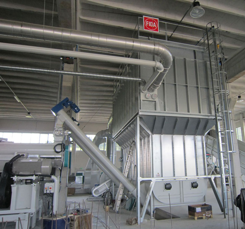 Filtro a pulizia automatica in contro corrente con aria compressa, funzionante in depressione a servizio di impianto di produzione pellet di cereali